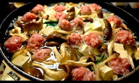 小松菜、大根、豆腐、ひらたけ100g、つくね、水900ccフライパンに入れ、丸鶏がらスープ大さじ1、ほんだし小さじ1を入れて沸かす