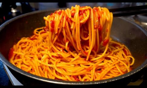 にんにく10gをオリーブオイル大さじ1半で炒め、鷹の爪3本分入れ炒め、ホールトマト200g、砂糖小さじ1/2、鶏ガラスープ小さじ1/2、昆布だし小さじ1/2、ハイミー4振りいれ煮詰め、ゆで汁で伸ばし1.9mmのパスタ100g入れオリーブオイル、粉チーズ