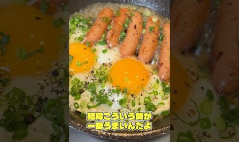 ニンニクの香りが出たらソーセージ3〜5本を強火で焼くき、焼き目が付いたら中火に落とし水大さじ2、鶏がら小さじ1、卵2個を入れ2分火を入れる。