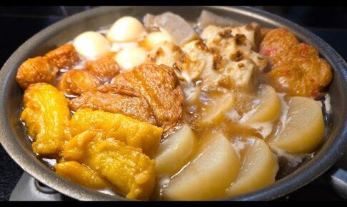 大根、茹で卵4個、こんにゃく220g、大根入れ、水1000cc、昆布だし大さじ1/2、鶏ガラスープ大さじ1/2、塩小さじ1/2、オイスターソース小さじ2を入れ沸かし、50分煮て玉ねぎボール1袋、丸天いか1パック、焼ちくわ1袋、生姜天1袋を入れて更に15分煮てもっち餅1袋を入れ数分煮て完成