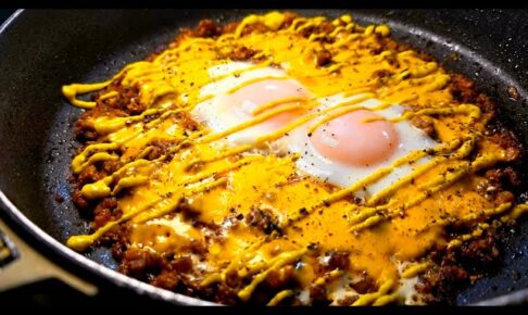 塩コショウした合挽き肉240g、玉ねぎ100g、油小さじ2で炒めらケチャップ大さじ3、ウスターソース大さじ1、コンソメ小さじ1、コショウ8ふり、ガーリックパウダー8振り入れ炒め、卵2個、チェダーチーズ40g散らし蓋をし半熟になったらイエローマスタードと黒胡椒