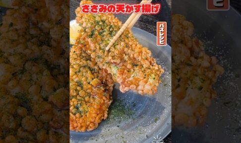 ささみ3本180gを叩き塩コショウし、薄力粉大さじ2、水大さじ2半、昆布だし小さじ1/3、おろし生姜5g混ぜ、天かすをつけて揚げ、アジシオ、青海苔、レモン
