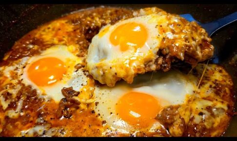 バター10gで塩コショウした合挽き肉300g炒め、玉ねぎ2/3個150g炒め、薄力粉大さじ1半、コンソメキューブ1個(顆粒だと小さじ2)、ケチャップ大さじ2、ウスターソース大さじ1半、コショウ6振り、ガーリックパウダー10振り入れ炒め、水120cc入れ煮て卵三つ割りピザチーズ60gかけ蓋をし半熟にし黒胡椒、水にさらして辛みを抜いた玉ねぎ1/3個、ご飯やパンにのせ完成