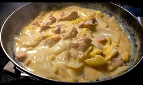 塩コショウした鶏もも肉300gを炒め、白菜350g炒め、しんなりしたらほんだし小さじ1、昆布だし小さじ1、薄力粉大さじ1を入れ炒め、豆乳250cc、塩1つまみ入れ黒胡椒で完成 柚子胡椒でくう