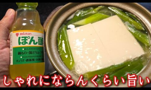 木綿豆腐または絹豆腐350gに長ネギ120g、水250cc入れ昆布だし小さじ1と1/3入れ沸かし、本物のぽん酢と塩で食うだけ